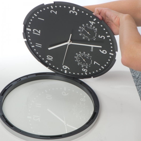 Elegancki zegar w wytrzymałej obudowie. Kontrastująca tarcza i duże cyfry. Dodatkowy wskaźnik temperatury i wilgotności powietrza. Brak baterii w zestawie.