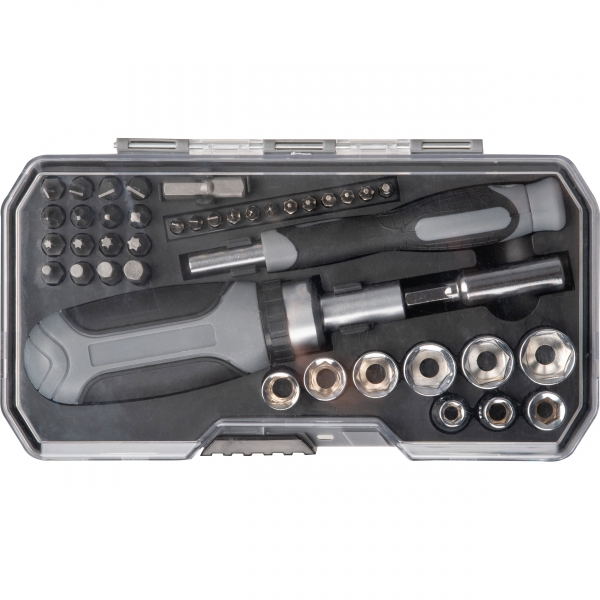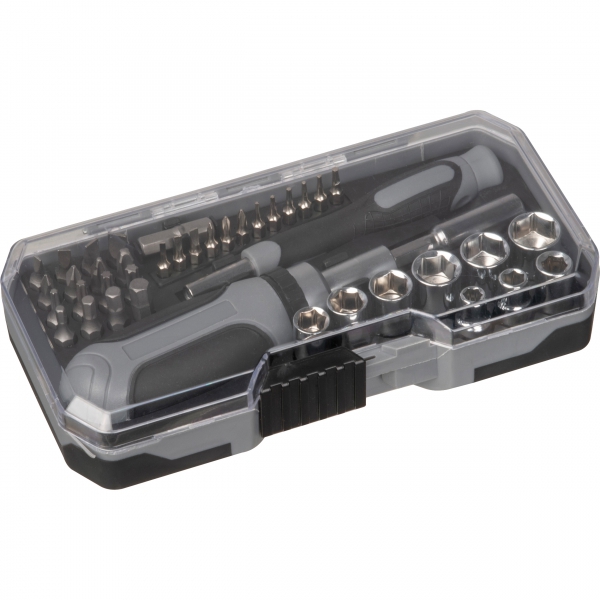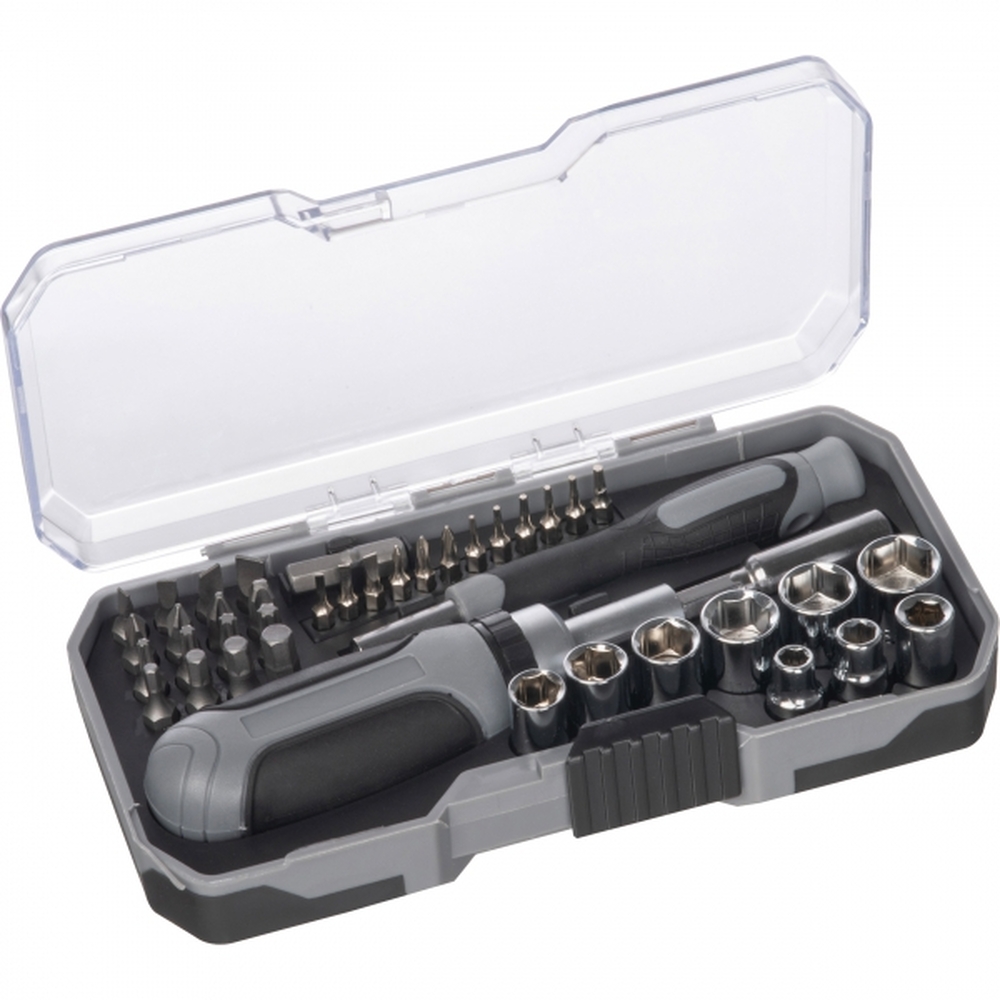 Zestaw 41 narzędzi to wszechstronna propozycja dla wszystkich, którzy cenią sobie precyzję i wygodę podczas prac naprawczych i montażowych. Komplet obejmuje 41 bitów oraz nakrętek w zróżnicowanych rozmiarach, co pozwala na łatwe dopasowanie do różnorodnych śrub i elementów. Dwa ergonomiczne uchwyty gwarantują pewny chwyt i komfort użytkowania, nawet przy dłuższych zadaniach. Wszystkie elementy zostały starannie uporządkowane i zabezpieczone w praktycznym, poręcznym pudełku, które ułatwia przechowywanie oraz transport zestawu, jednocześnie chroniąc narzędzia przed zgubieniem czy uszkodzeniem.