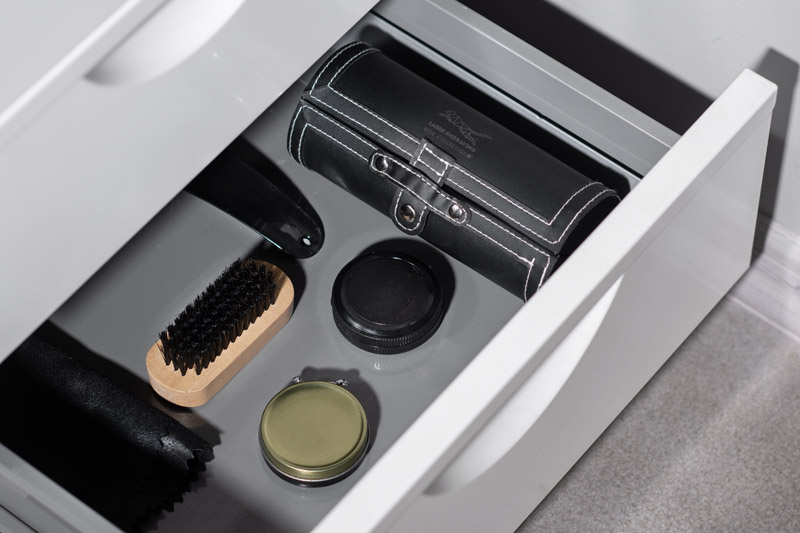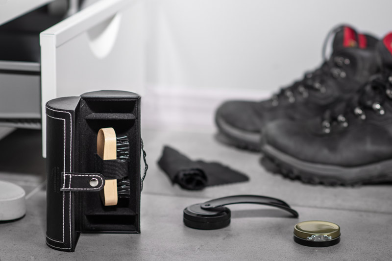 Zestaw do czyszczenia obuwia SHINBO wykonany z materiału skóropodobnego (PU). Zawiera pastę bezbarwną, czyścik, łyżkę do butów, ściereczkę i szczotkę.