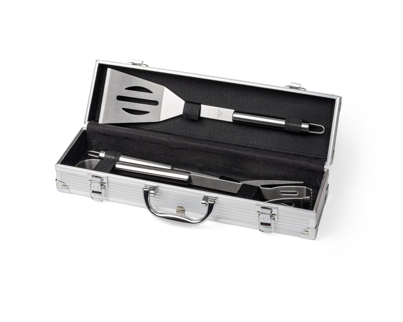 Praktyczny zestaw do grillowania zawierający tylko najbardziej niezbędne przyrządy: łopatkę, szpikulec, szczypce. Pakowany w wygodną walizeczkę. Logo wygrawerujemy na blaszce umieszczonej na walizeczce. Blaszka jest dołączona osobno.