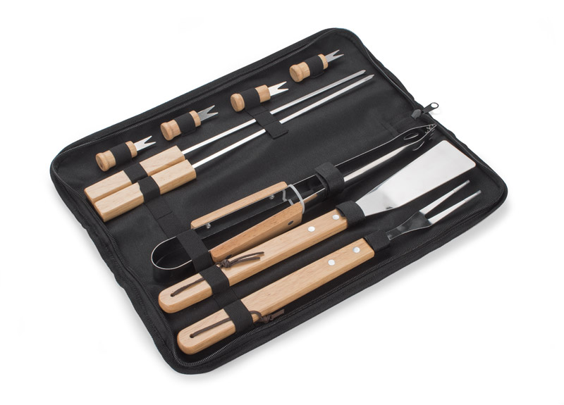PANO to 9-elementowy zestaw do grilla w praktycznym etui zapinanym na zamek i wyposażonym w regulowany pasek dla wygody przenoszenia. W zestawie znajduje się łopatka, widelec, szczypce, szpile do szaszłyków (2 szt.) i uchwyty do kukurydzy (4 szt.). Uchwyty wszystkich elementów wykonane są z drewna.
