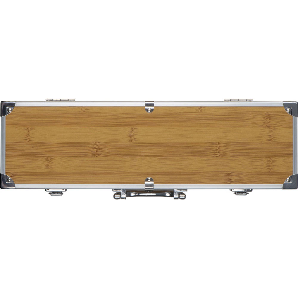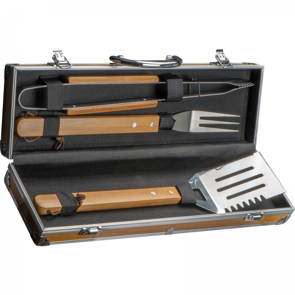 Zestaw do grilla to elegancki i praktyczny komplet składający się z trzech niezbędnych narzędzi: szczypiec (36 cm), widelca do mięsa (38 cm) oraz szpatułki (38,5 cm), wykonanych z trwałej stali nierdzewnej, która gwarantuje odporność na korozję i łatwość czyszczenia. Każde narzędzie posiada bambusową rączkę, która nie tylko nadaje zestawowi naturalnego, stylowego wyglądu, ale także pozostaje chłodna podczas pracy, zwiększając komfort i bezpieczeństwo użytkowania.
