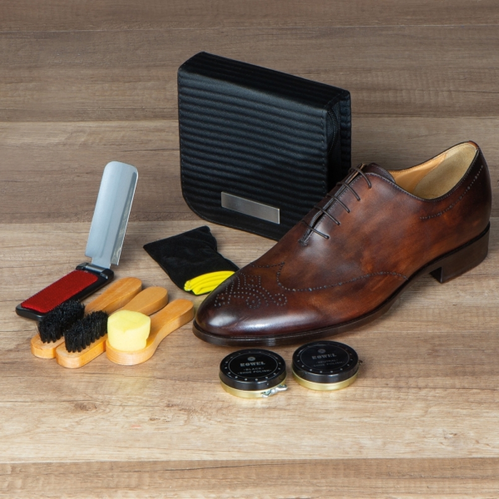 Zestaw do pielęgnacji obuwia w eleganckim etui z tworzywa sztucznego to kompleksowe narzędzie do codziennej troski o Twoje buty. W jego skład wchodzą dwie szczotki z drewnianymi uchwytami i miękkim włosiem, które delikatnie, lecz skutecznie usuwają zabrudzenia, nie niszcząc materiału. Metalowa łyżka do butów, połączona ze szczotką do ubrań, ułatwia wygodne wkładanie obuwia i zachowanie ich kształtu. Zestaw zawiera także dwie pasty – czarną, podkreślającą głębię ciemnych kolorów, oraz bezbarwną, chroniącą jasne buty przed wilgocią i codziennym zużyciem.