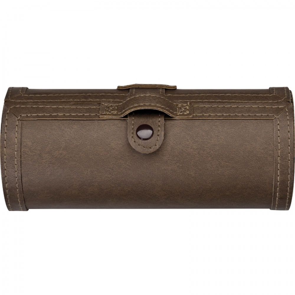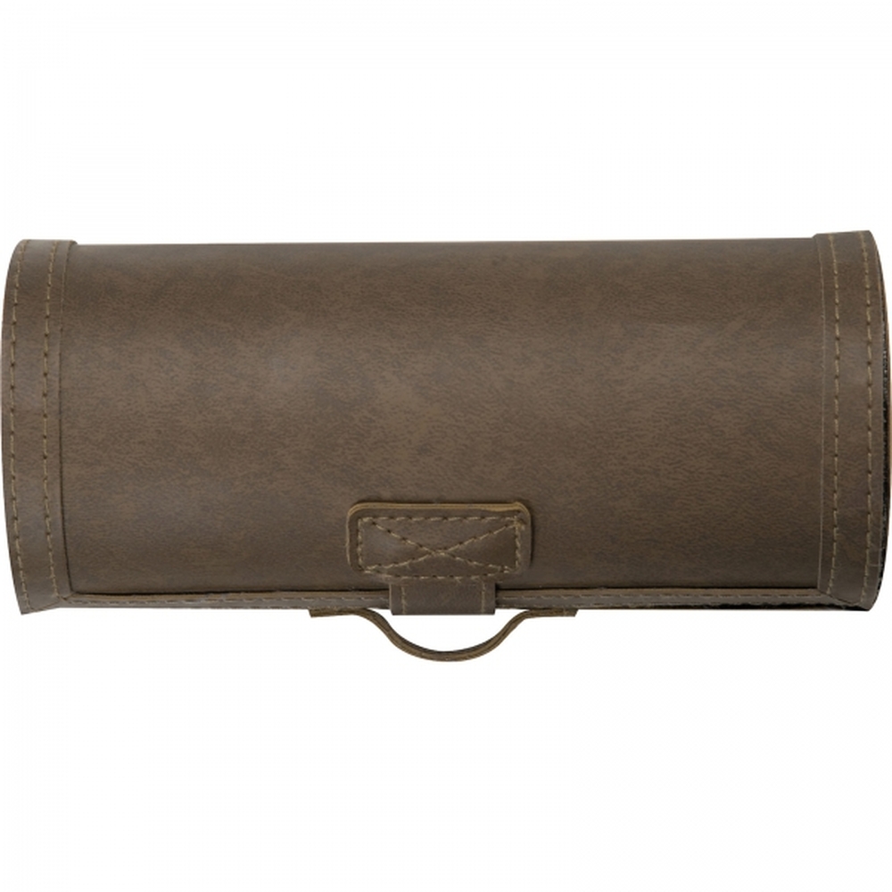 Zestaw do pielęgnacji obuwia w brązowym etui z ekologicznej skóry. Bezbarwna pasta, mała gąbka do czyszczenia, szczotka do obuwia, szmatka do polerowania oraz łyżka do butów.
