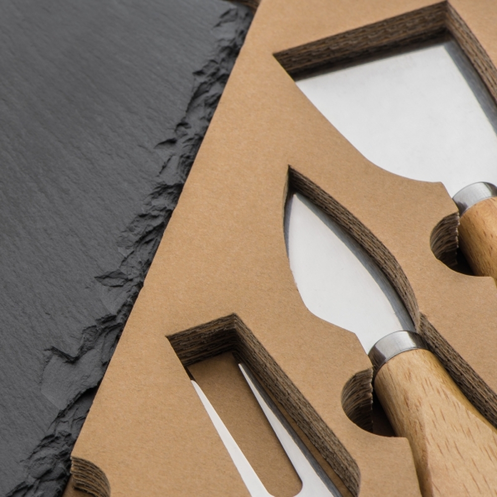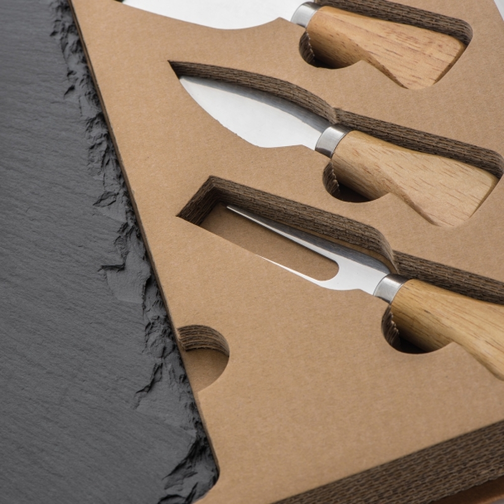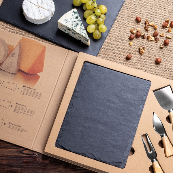 Zestaw zapakowany w solidne kartonowe pudełko. W środku znajduje się deska z łupka i zestaw 3 sztućców do sera.