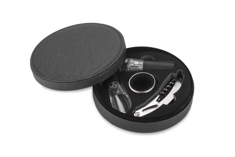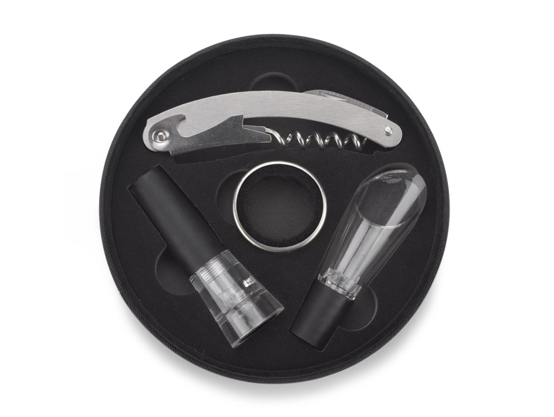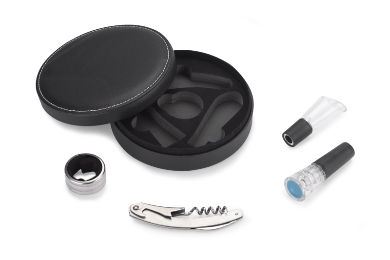 Elegancki czteroelementowy zestaw do wina pakowany w pudełko wykończone ekoskórą. W zestawie: próżniowy korek do wina, nalewak z funkcją aeratora, otwieracz i opaska na butelkę. Próżniowy korek z pompką zasysającą powietrze z butelki pozwala na dłuższe przechowywanie otwartego wina bez utraty cennych aromatów. Nalewak z funkcją aeratora napowietrza wino uwalniając jego aromaty.