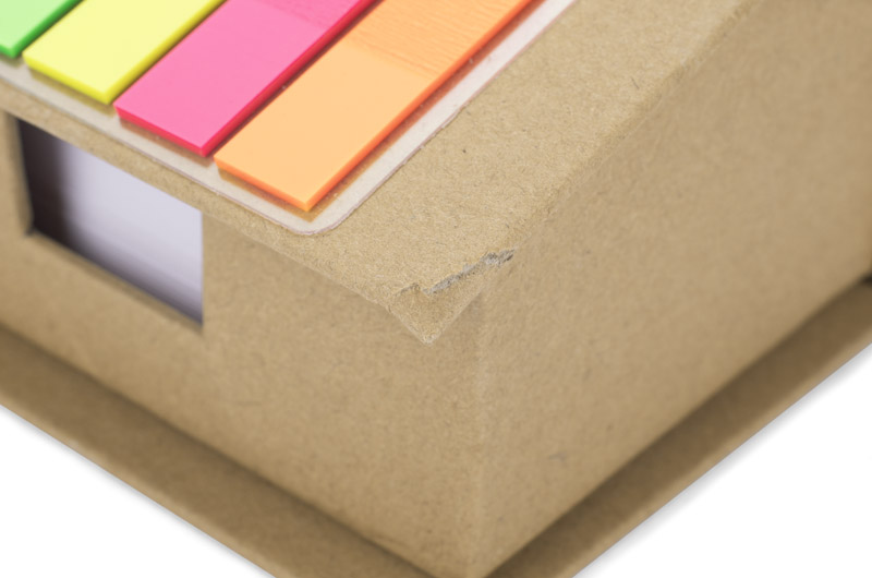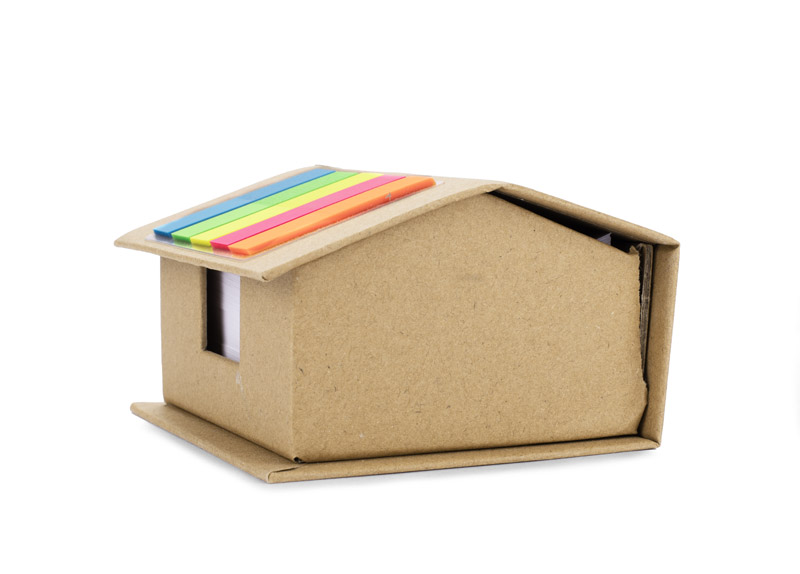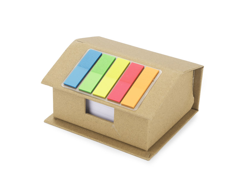 Ekologiczny pojemnik na karteczki ( 370 szt.) w kształcie domku. Dodatkowo znaczniki samoprzylepne w pięciu kolorach (po 25 znaczników w każdym kolorze). Logo wykonamy na powierzchni dachu.Układ poszczególnych kolorów karteczek w ramach jednej partii może się różnić.