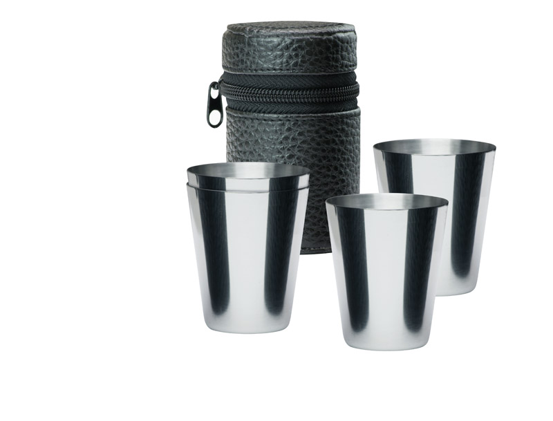 Cztery kieliszki stalowe o pojemności 30 ml pakowane w etui z materiału skóropodobnego (PU) PU zapinanego na zamek. Logo grawerujemy na powierzchni kieliszków.