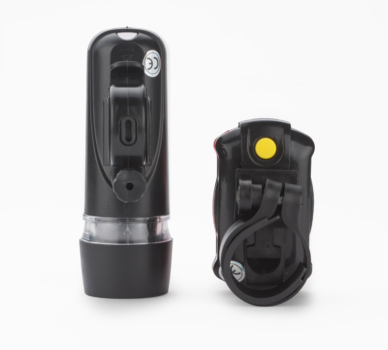 AZER to zestaw lampek rowerowych o ekonomicznym źródle światła LED. Mocne światło przednie i zapewniające widoczność z kilkuset metrów światło tylne sprawią, że bez obaw będziesz jeździć o każdej porze dnia i nocy. Charakteryzują się bardzo łatwym montażem. Lampka przednia posiada 5 białych diod LED i 3 tryby świecenia: jeden ciągły i dwa migające. Natomiast lampka tylna posiada 5 czerwonych diod LED i 7 trybów świecenia: jeden ciągły i 6 migających.