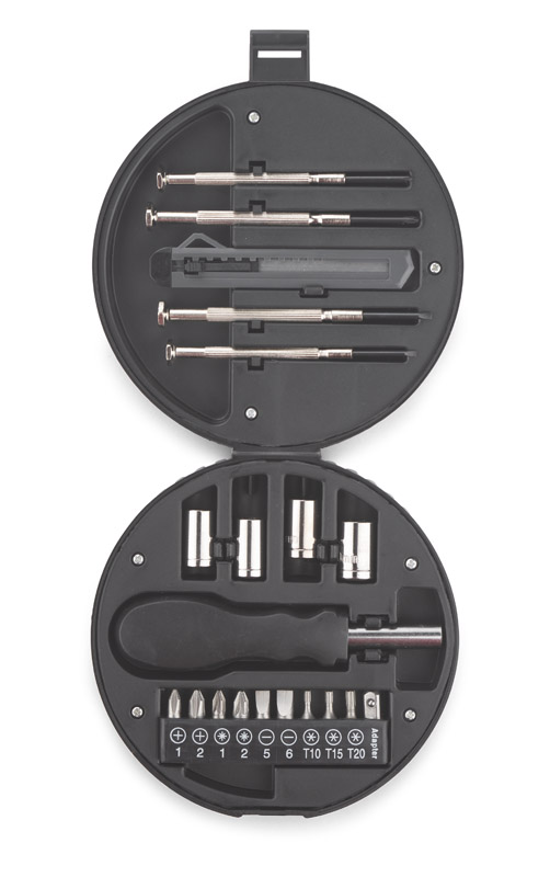 WHEEL to zestaw, w którym znajduje się wiele przydatnych narzędzi: cztery śrubokręty precyzyjne, nożyk do tapet, uchwyt, cztery klucze nasadkowe z przejściówką i dziewięć bitów. Wszystko razem zamknięte jest w charakterystyczne etui w kształcie koła samochodowego.