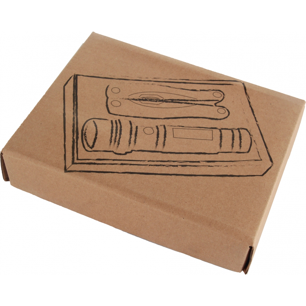 Zestaw składający się z metalowej latarki z 14 diodami LED oraz wielofunkcyjnego narzędzia (m. in. obcęgi, pilniki, śrubokręty, piłka, nóż, otwieracz). Latarka zawiera baterie.