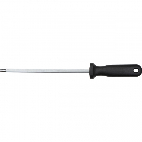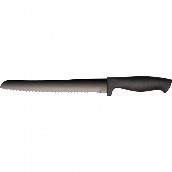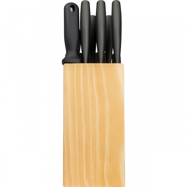 Zestaw 14 noży w różnych rozmiarach o tytanowych ostrzach. Całość została umieszczona w solidnym stojaku, wykonanym z drewna sosnowego.