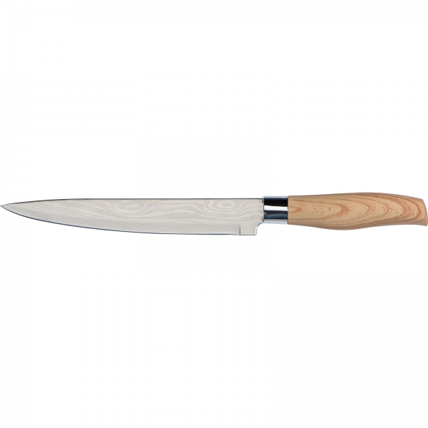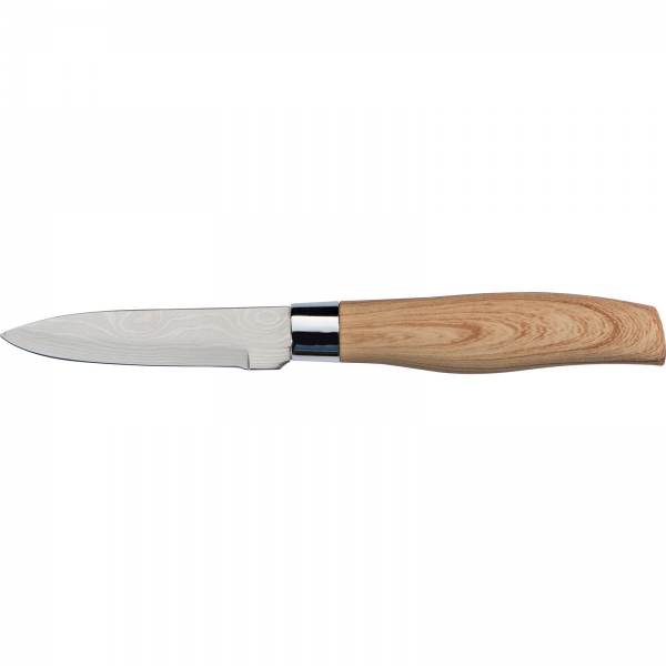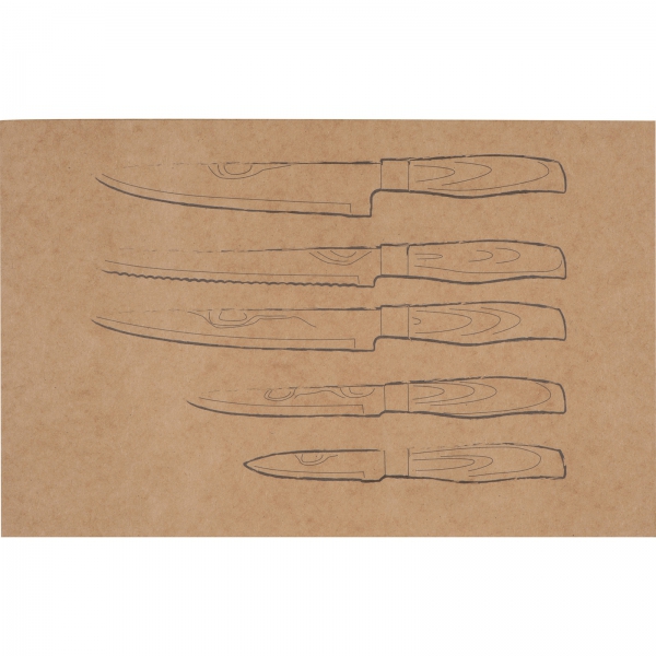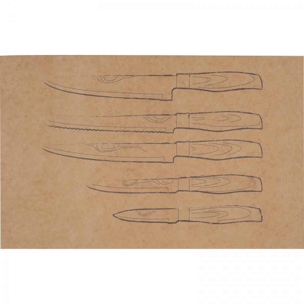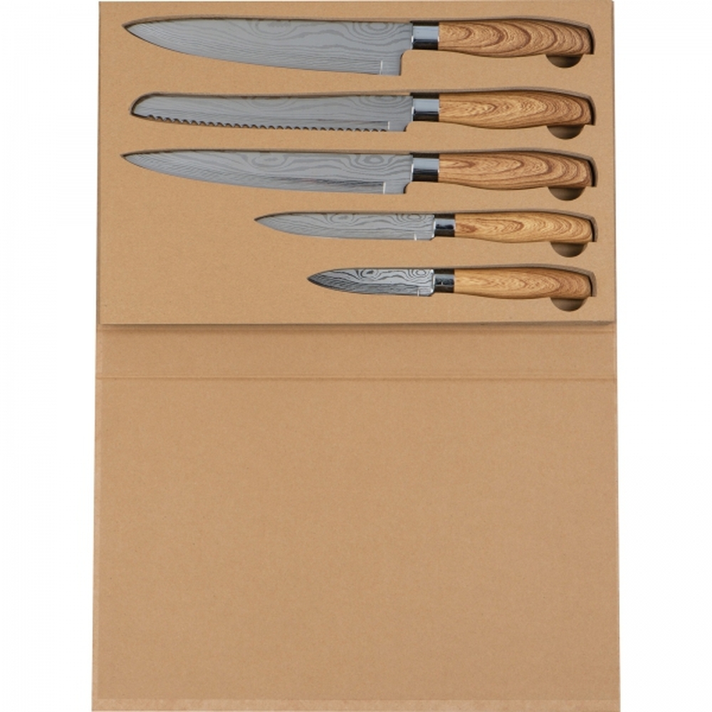 Zestaw 5 noży kuchennych w różnych rozmiarach. Noże posiadają ostrze ze stali nierdzewnej i antypoślizgową rękojeść z tworzywa imitującego drewno.