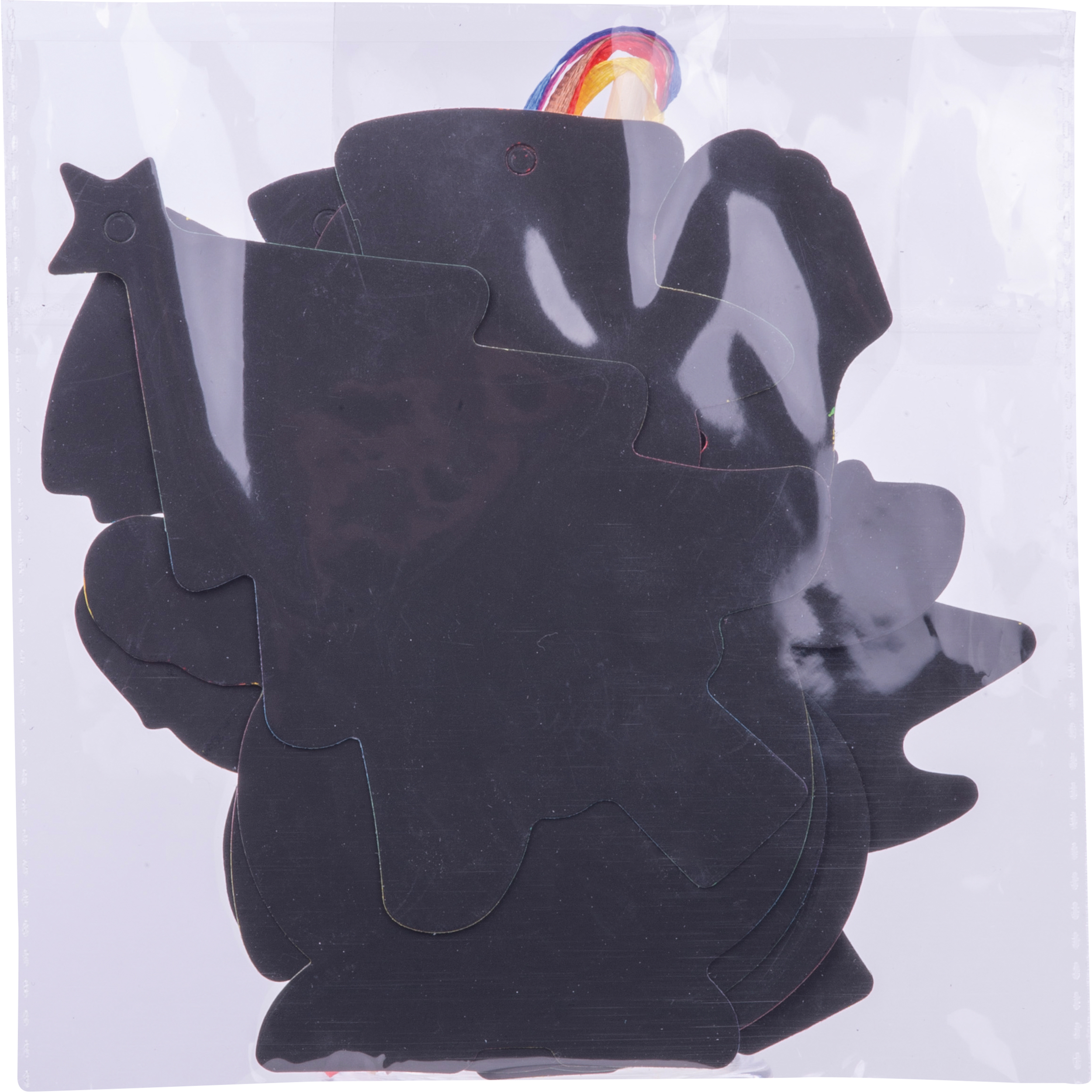 Zestaw 6 świątecznych ozdób, wykonanych z czarnego papieru - zdrapywanki. W zestawie nitki do zawieszania oraz drewniany patyczek do wydrapywania wzorków na czarnej powierzchni zawieszek.