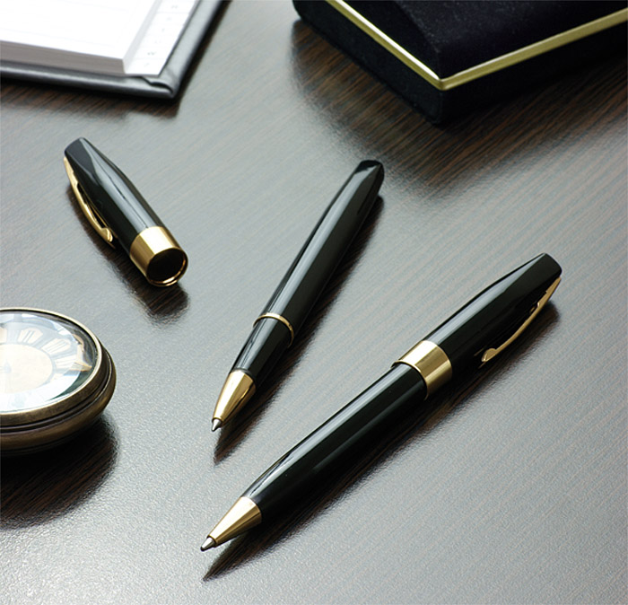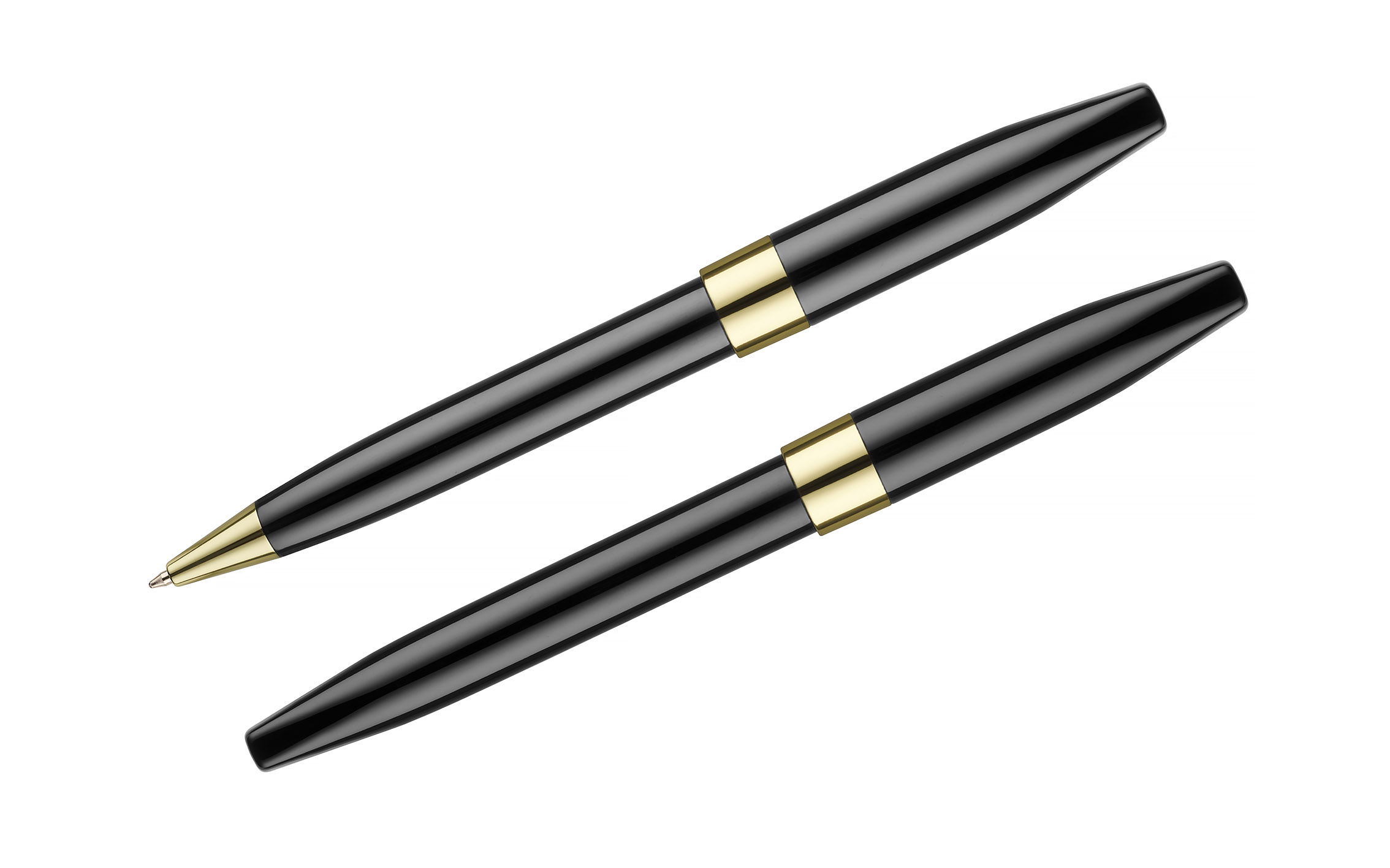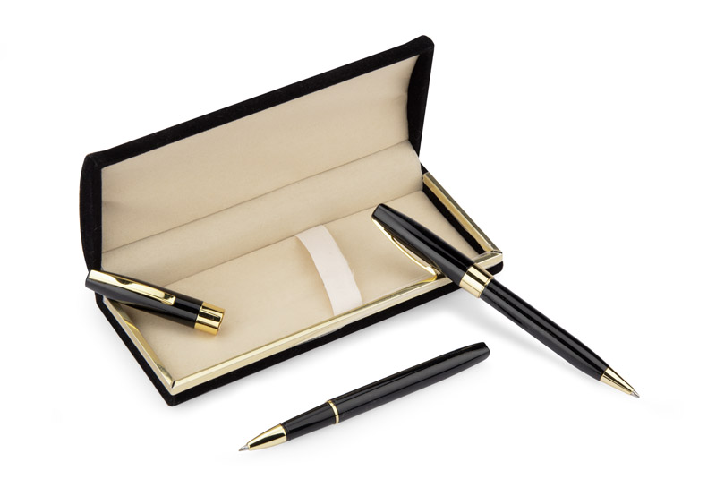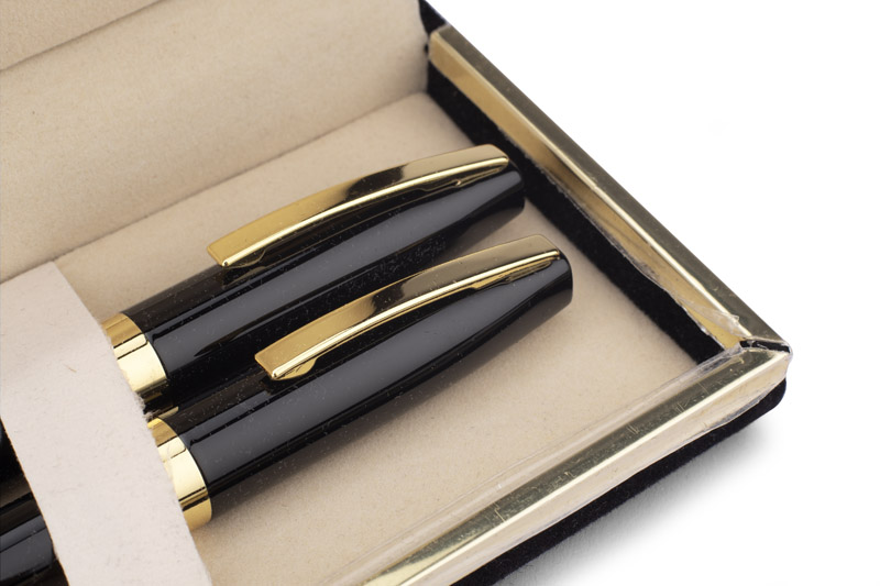 Komplet piśmienniczy ARIZONA ze złotymi wykończeniami pakowany jest w eleganckie etui wykonane z czarnego weluru. W zestawie znajduje się długopis z niebieskim wkładem oraz pióro kulkowe (rollerball) z czarnym wkładem. Logo grawerujemy w kolorze złotym na górnej części obu elementów zestawu, co nadaje im spójny i prestiżowy charakter.