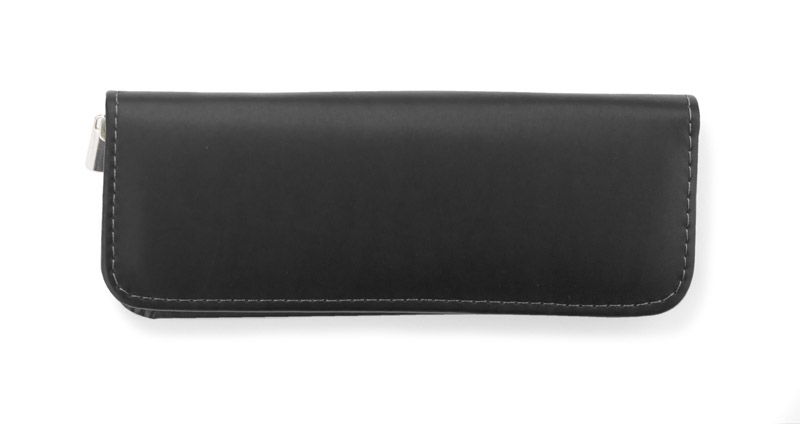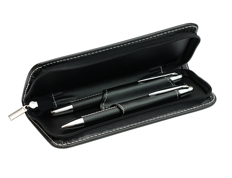 Komplet piśmienniczy Elegance: długopis i pióro kulkowe w etui z materiału skóropodobnego (PU). Długopis i pióro kulkowe z wkładami w kolorze niebieskim. Logo wygrawerujemy na artykułach piśmienniczych.