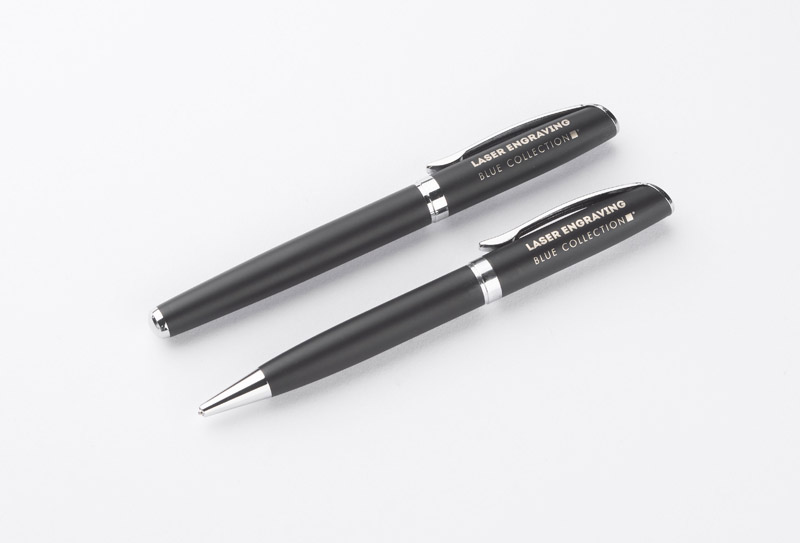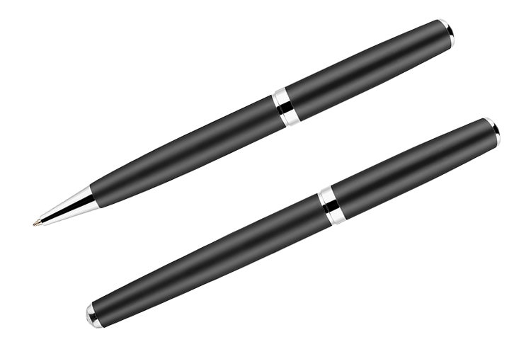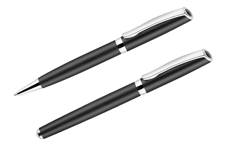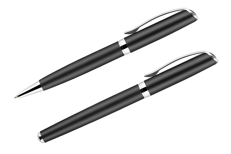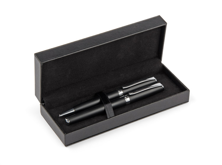 GEORGIA to elegancki zestaw piśmienniczy składający się z długopisu oraz pióra wiecznego. Przybory piśmiennicze wykonane z metalu zapakowane są w etui z czarnego materiału skóropodobnego (PU). Długopis z mechanizmem typu twist. Do pióra wiecznego dołączony jest jeden nabój z atramentem. Wkład długopisu oraz atrament naboju do pióra w kolorze czarnym.Pakowany w czarny kartonik lub biały rękaw.