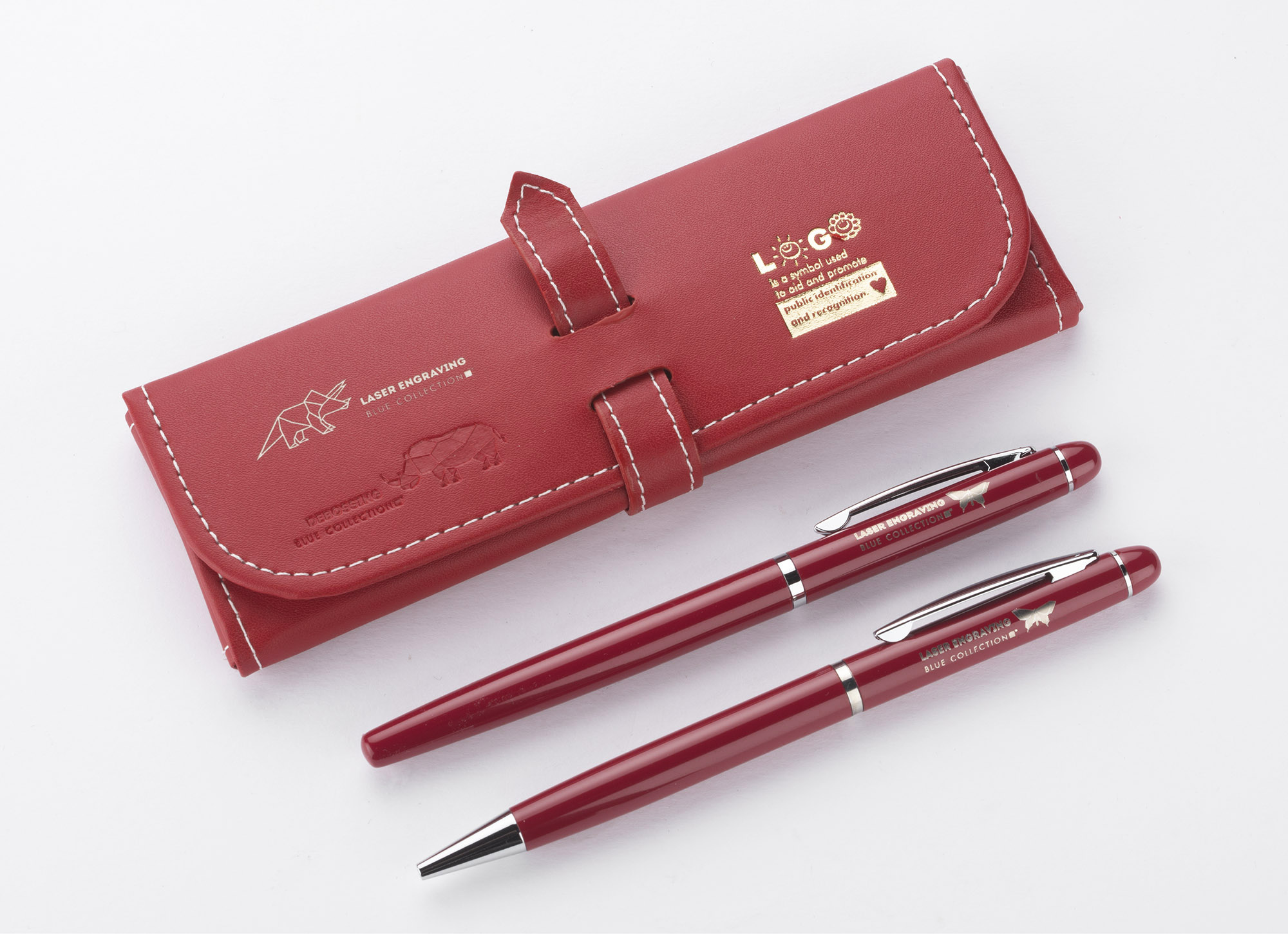 Elegancki zestaw piśmienniczy pakowany w etui z materiału skóropodobnego (PU). W zestawie znajdują się długopis oraz pióro kulkowe. Logo wygrawerujemy na powierzchni artykułów piśmienniczych.