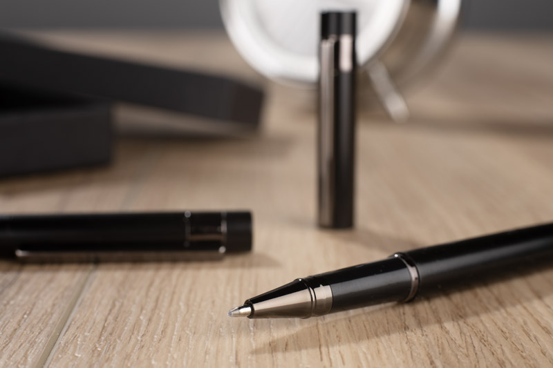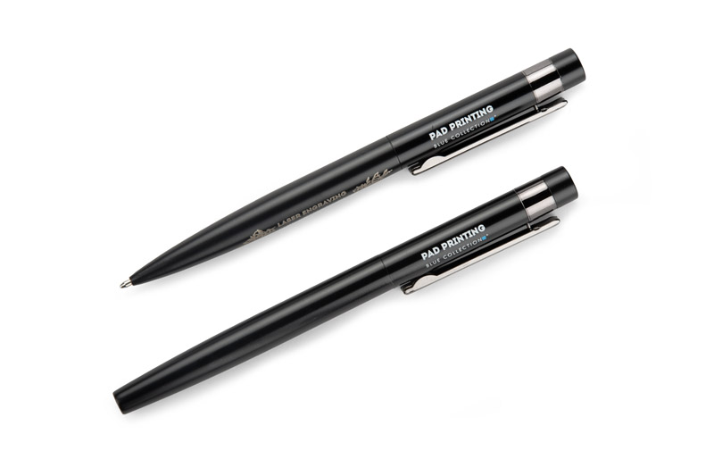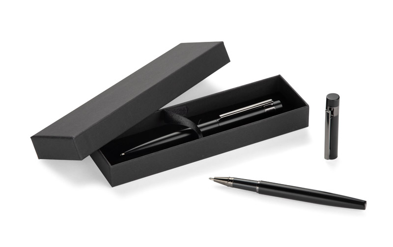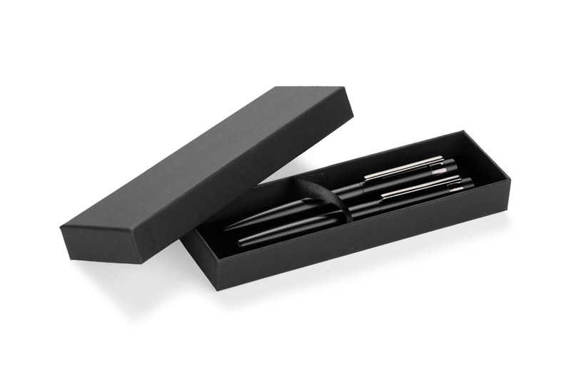 Zestaw piśmienniczy ZILE w etui zawiera metalowy długopis i pióro kulkowe o nowoczesnym wykończeniu. Całość uzupełnia elegancki, ciemnoszary klips, który nadaje zestawowi profesjonalny charakter. Doskonały wybór na biznesowy upominek.