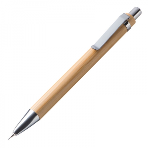 Zestaw piśmienniczy wykonany z drewna, z długopisem piszącym na niebiesko i ołówkiem automatycznym.