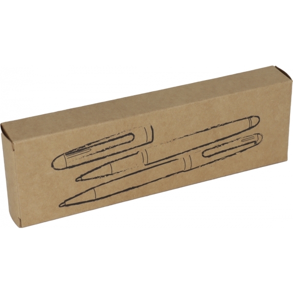 Zestaw piśmienniczy wykonany z drewna z metalowymi wkładami, piszącymi na niebiesko. Długopis z mechanizmem obrotowym.