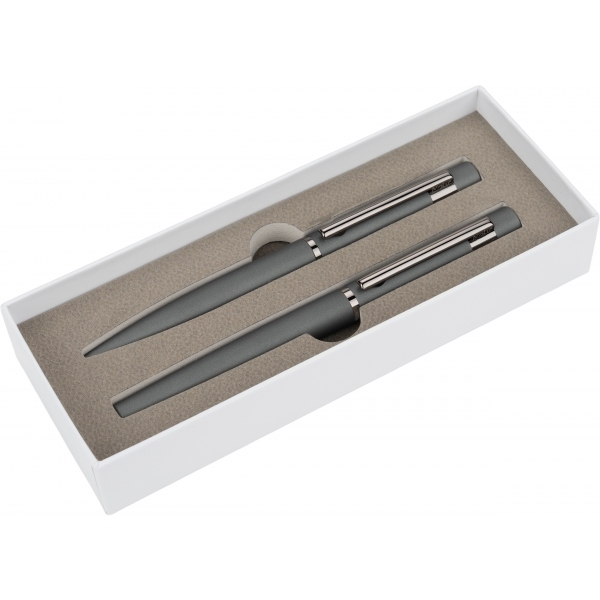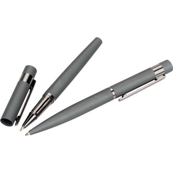 Zestaw piśmienny marki MoLu, składający się z długopisu i pióra kulkowego z gumowaną powierzchnią soft touch.