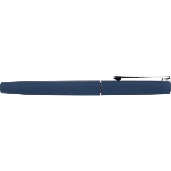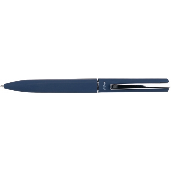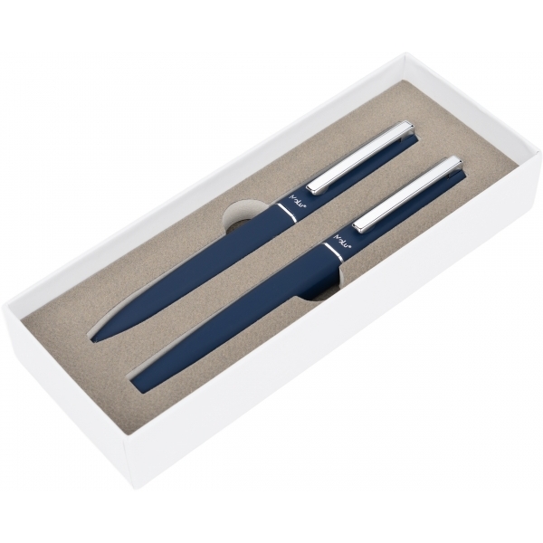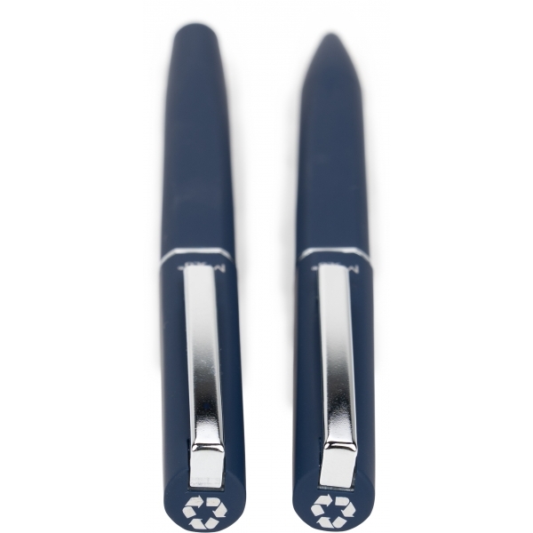 Zestaw piśmienniczy, składający się z długopisu i pióra kulkowego, wykonanych ze stali nierdzewnej, pochodzącej z recyklingu. Oba instrumenty piśmiennicze posiadają gumową powłokę i akcenty w kolorze gun-metal.
