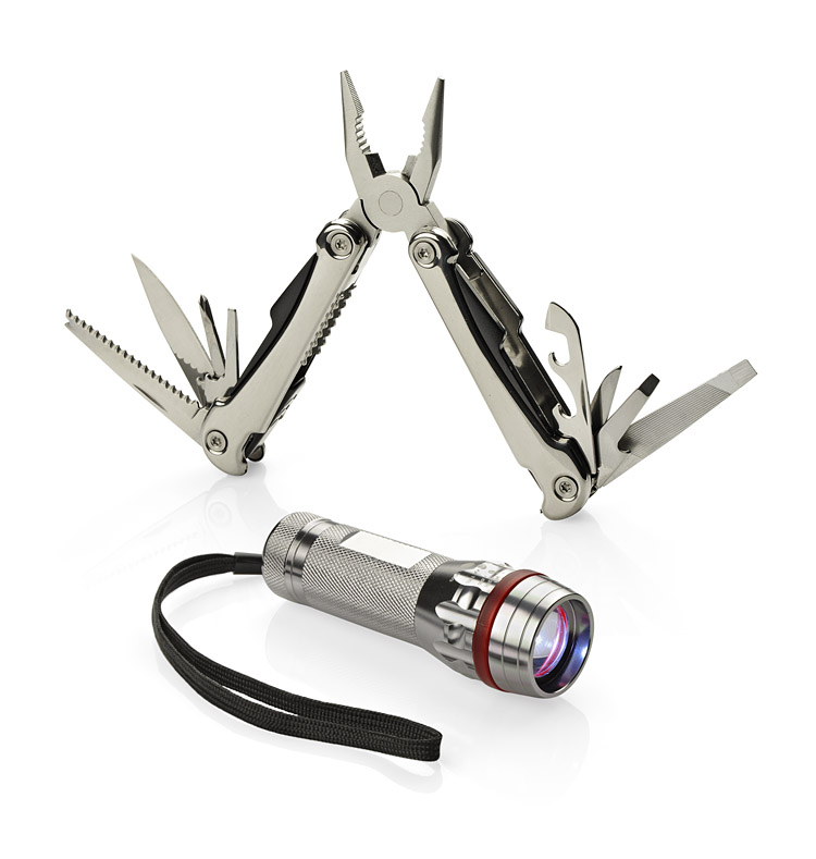 Zestaw upominkowy zawierający latarkę oraz narzędzie wielofunkcyjne. Latarka posiada bardzo jasną diodę, możliwość regulacji wiązki światła oraz 3 tryby świecenia: mocny, słaby oraz migający. Każdy element jest wykonany z metalu a całość zapakowana w eleganckie czarne pudełko.