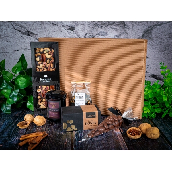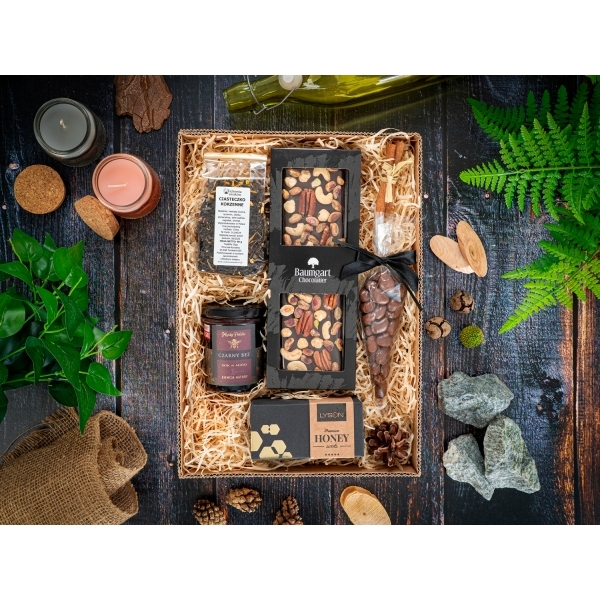 W przypadku braku dostępności produktów z oferty zastrzegamy sobie prawo do zamiany produktów na równowartościowe; zawsze po wcześniejszej akceptacji przez Klienta. Korzenna rozkosz to paczka pełna wyjątkowych smaków! Zawiera herbatę aromatyzowaną ciasteczko korzenne (50 g), miód z sokiem z czarnego bzu (200 g), mleczną czekoladę z orzechami pekan, laskowymi i pistacjami (175 g), miodową krówkę (120 g) oraz migdały w czekoladzie (80 g). Całość zapakowana w eleganckie opakowanie, gotowa do wręczenia lub do rozkoszowania się smakiem!