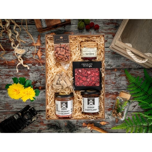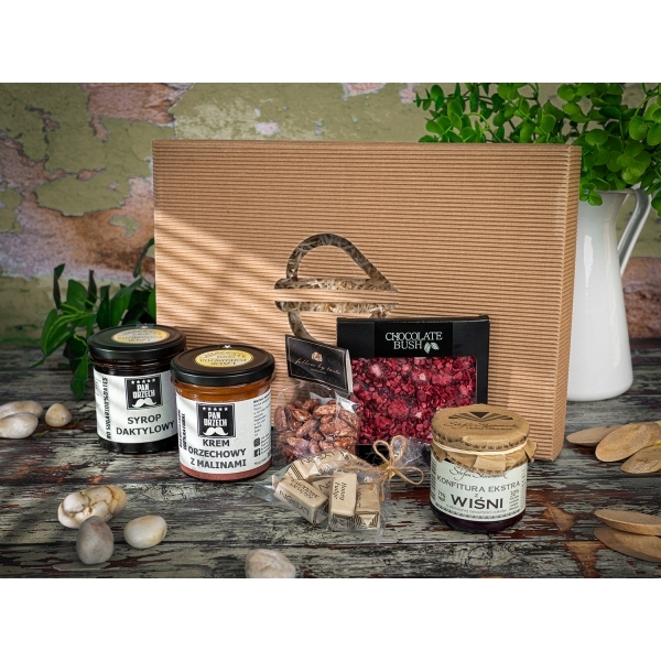 W przypadku braku dostępności produktów z oferty zastrzegamy sobie prawo do zamiany produktów na równowartościowe; zawsze po wcześniejszej akceptacji przez Klienta. Owocowy raj to paczka pełna naturalnych smaków, idealna dla smakoszy! Zawiera konfiturę extra z wiśni (200 g), mleczną czekoladę z liofilizowanymi malinami (85 g), syrop daktylowy (400 g), krem orzechowy z malinami (300 g), miodowe krówki (70 g) oraz prażone orzechy nerkowca (70 g). Całość zapakowana w eleganckie opakowanie, gotowa na prezent lub do delektowania się!
