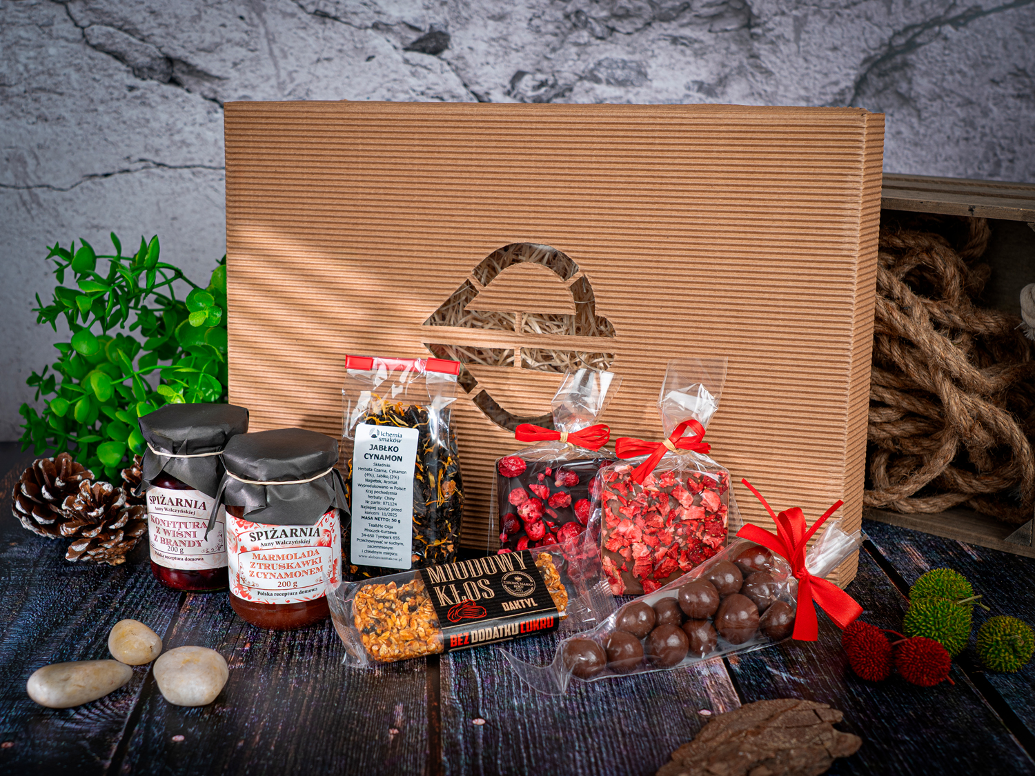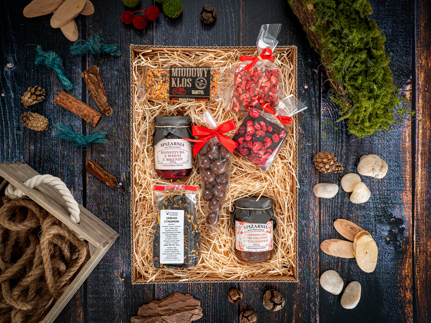 W przypadku braku dostępności produktów z oferty zastrzegamy sobie prawo do zamiany produktów na równowartościowe; zawsze po wcześniejszej akceptacji przez Klienta. Zestaw prezentowy Smakowite Chwile to elegancka kompozycja wyselekcjonowanych przysmaków dla smakoszy. Zawiera miodowy batonik Kłos z daktylem (45 g), konfiturę wiśnia z brandy (200 g), marmoladę truskawkową z cynamonem (200 g), aromatyczną herbatę jabłko-cynamon (50 g) oraz wykwintne czekoladki z malinami i żurawiną (2 × 20 g). Całość uzupełniają orzechy laskowe w czekoladzie deserowej (80 g). Zapakowany w eleganckie opakowanie z rafią, stanowi doskonały prezent dla miłośników wyjątkowych smaków.