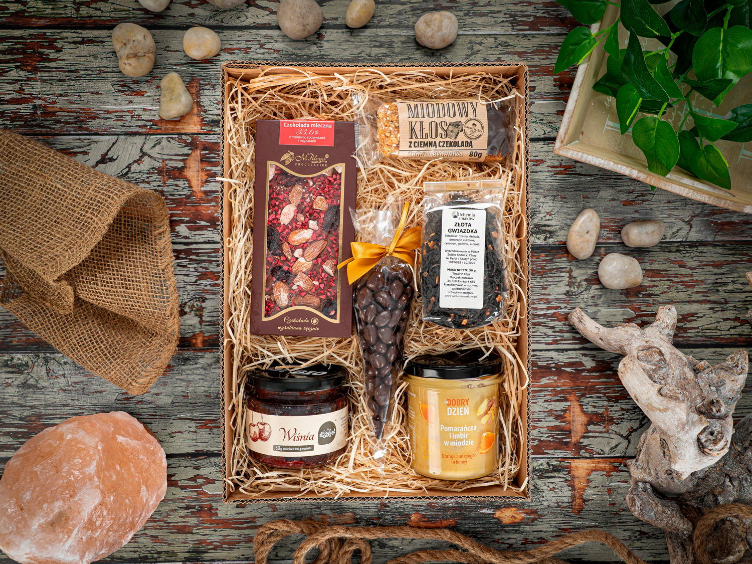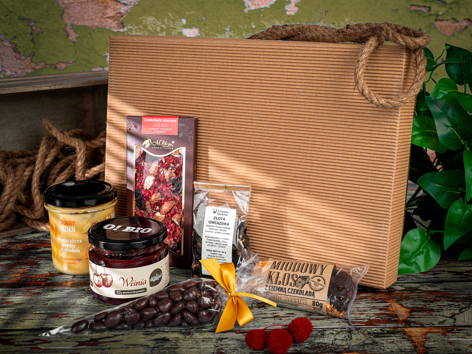 W przypadku braku dostępności produktów z oferty zastrzegamy sobie prawo do zamiany produktów na równowartościowe; zawsze po wcześniejszej akceptacji przez Klienta. Zestaw prezentowy Zmysłowe Smaki to elegancka kompozycja dla smakoszy. Zawiera mleczną czekoladę z malinami, rodzynkami i migdałami (85 g), konfiturę wiśniową (295 g), miód z pomarańczą i imbirem (375 g), aromatyzowaną herbatę Złota Gwiazdka (50 g), batonik miodowy Kłos z ciemną czekoladą (80 g) oraz bakalie (żurawina/agrest) w czekoladzie deserowej (80 g). Całość zapakowana w stylowe opakowanie z wypełnieniem i ozdobną rafią, tworzy wyjątkowy prezent pełen luksusowych smaków.