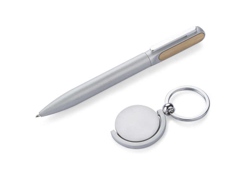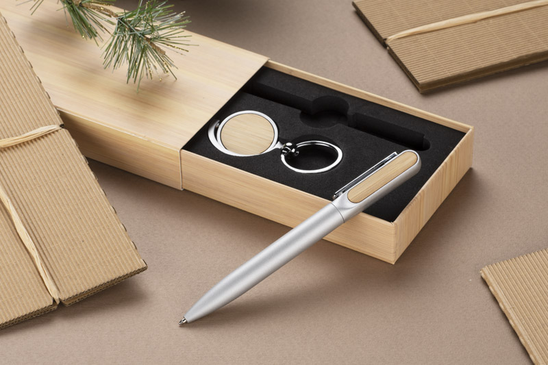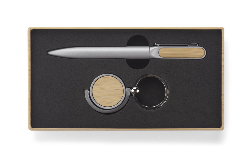 Elegancki zestaw upominkowy SELO składa się z długopisu i breloka. Oba produkty posiadają bambusowe elementy co nadaje im interesujący wygląd. Zestaw SELO to idealny pomysł na prezent. Zapakowane w pudełko imitujące bambus.