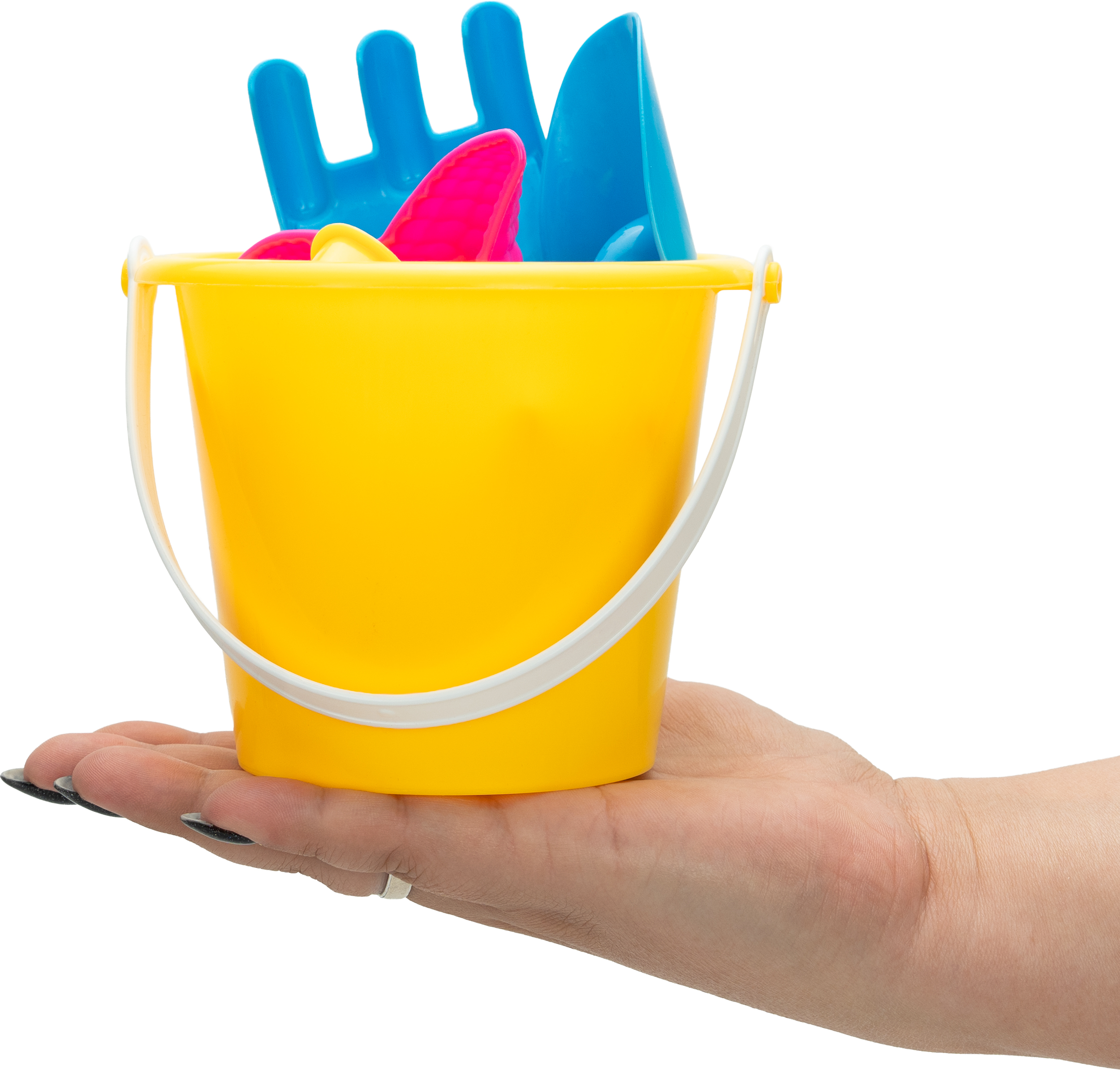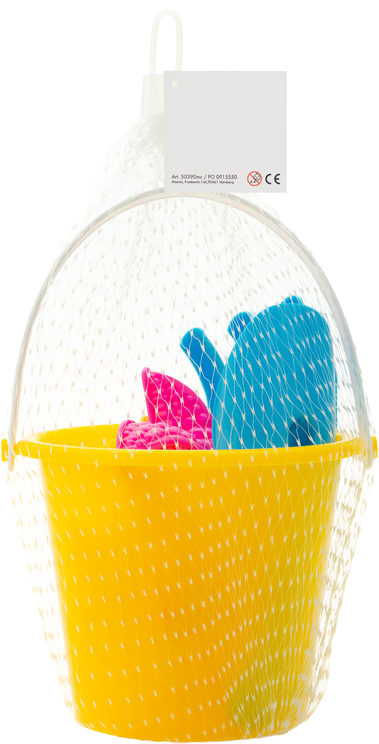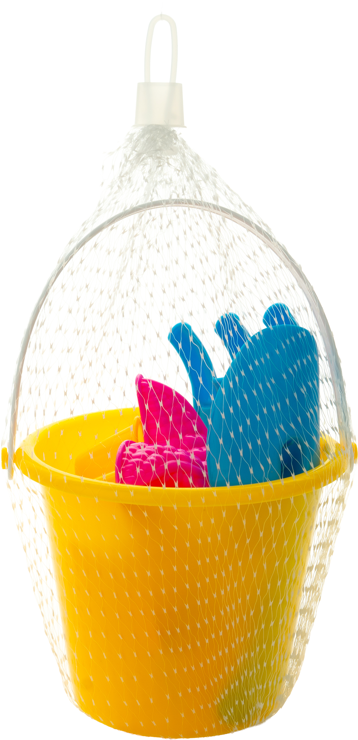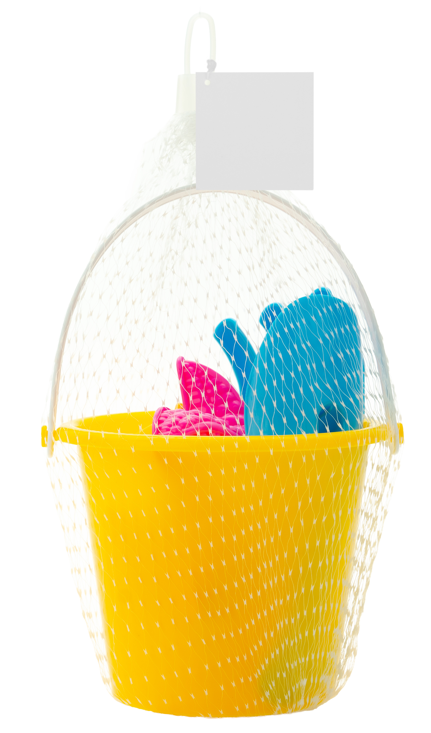 Plastikowe zabawki na plażę lub do piaskownicy: wiaderko, 2 foremki, łopatka i grabki. Całość umieszczona w siatce.
