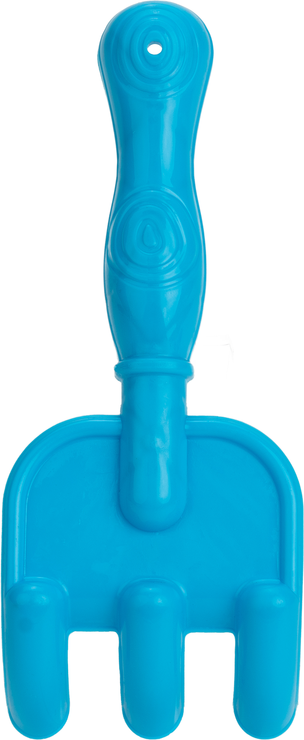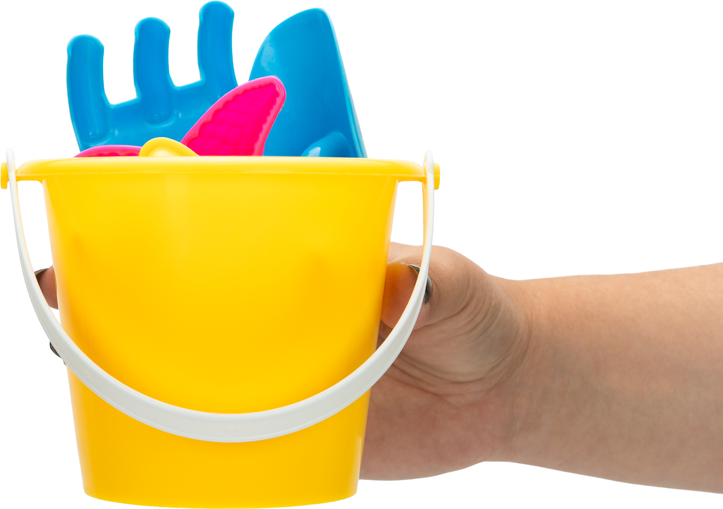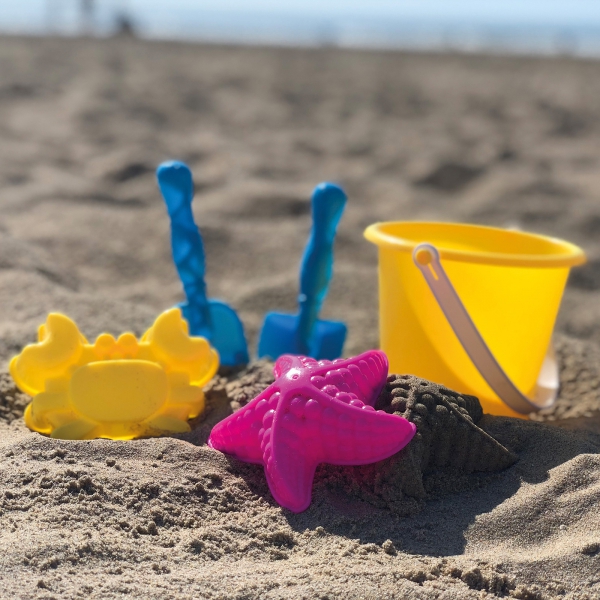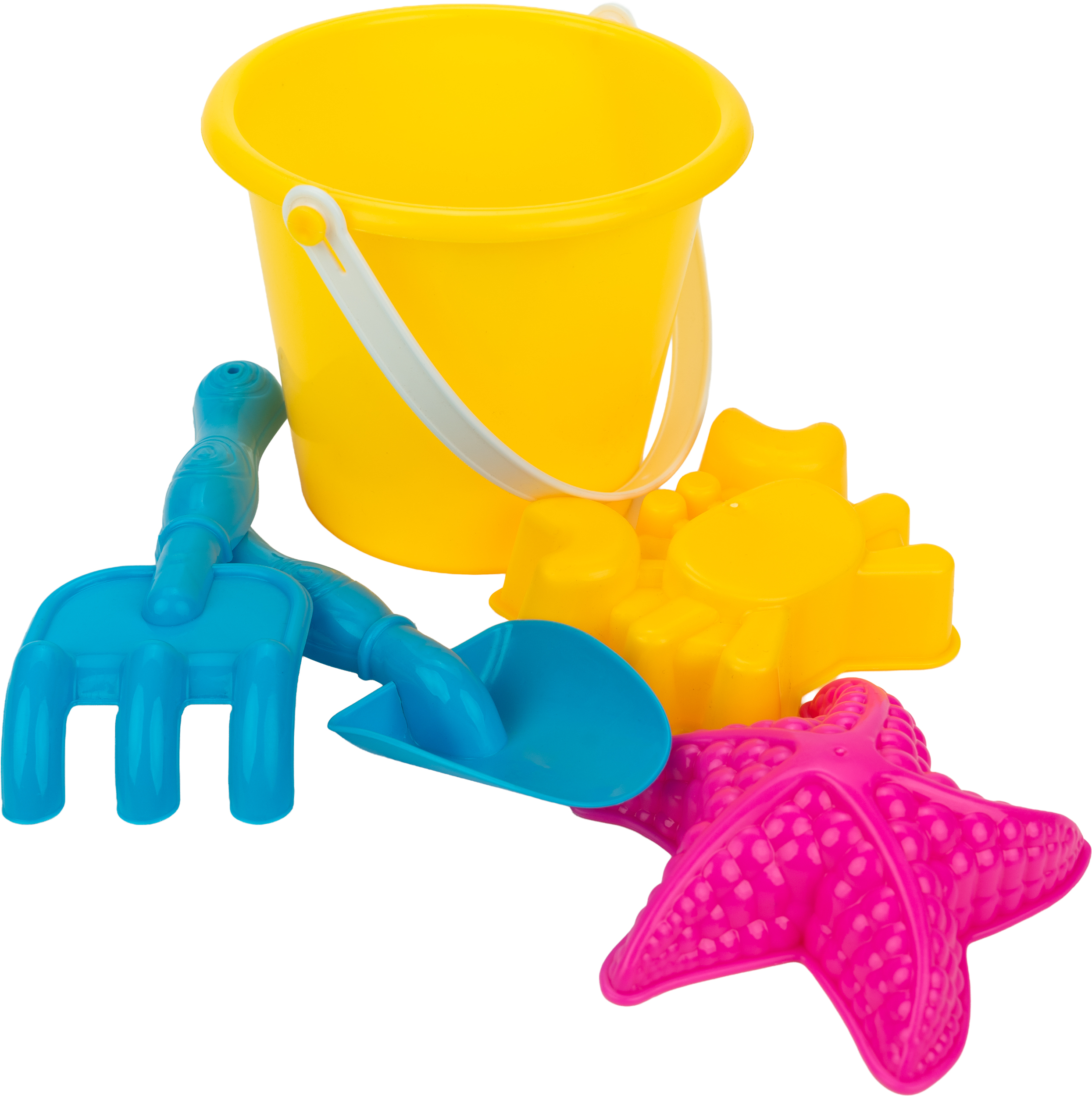 Plastikowe zabawki na plażę lub do piaskownicy: wiaderko, 2 foremki, łopatka i grabki. Całość umieszczona w siatce.