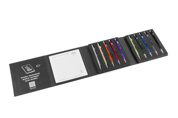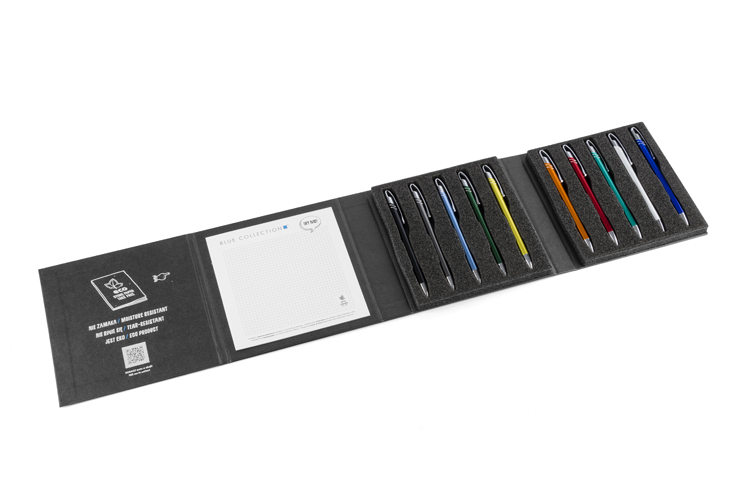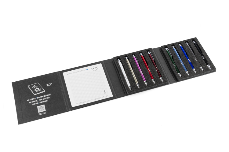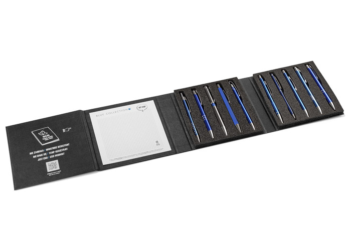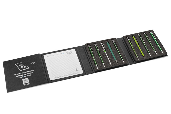41,25 zł+ 23% VATNowoczesny i elegancki wzornik mieszczący 10 najpopularniejszych metalowych długopisów z oferty Blue Collection. Staranne wykonanie zrobi wrażenie na każdym, który go otrzyma. Będzie idealnym materiałem do prezentacji, dzięki umieszczonemu wewnątrz notesowi z papieru kamiennego da możliwość jednoczesnego przetestowania długopisów.