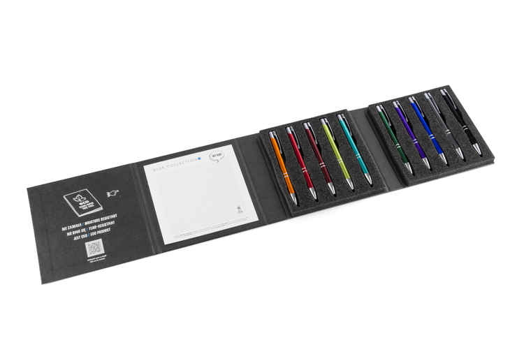 35,50 zł+ 23% VATNowoczesny i elegancki wzornik mieszczący 10 najpopularniejszych metalowych długopisów z oferty Blue Collection. Staranne wykonanie zrobi wrażenie na każdym, który go otrzyma. Będzie idealnym materiałem do prezentacji, dzięki umieszczonemu wewnątrz notesowi z papieru kamiennego da możliwość jednoczesnego przetestowania długopisów.